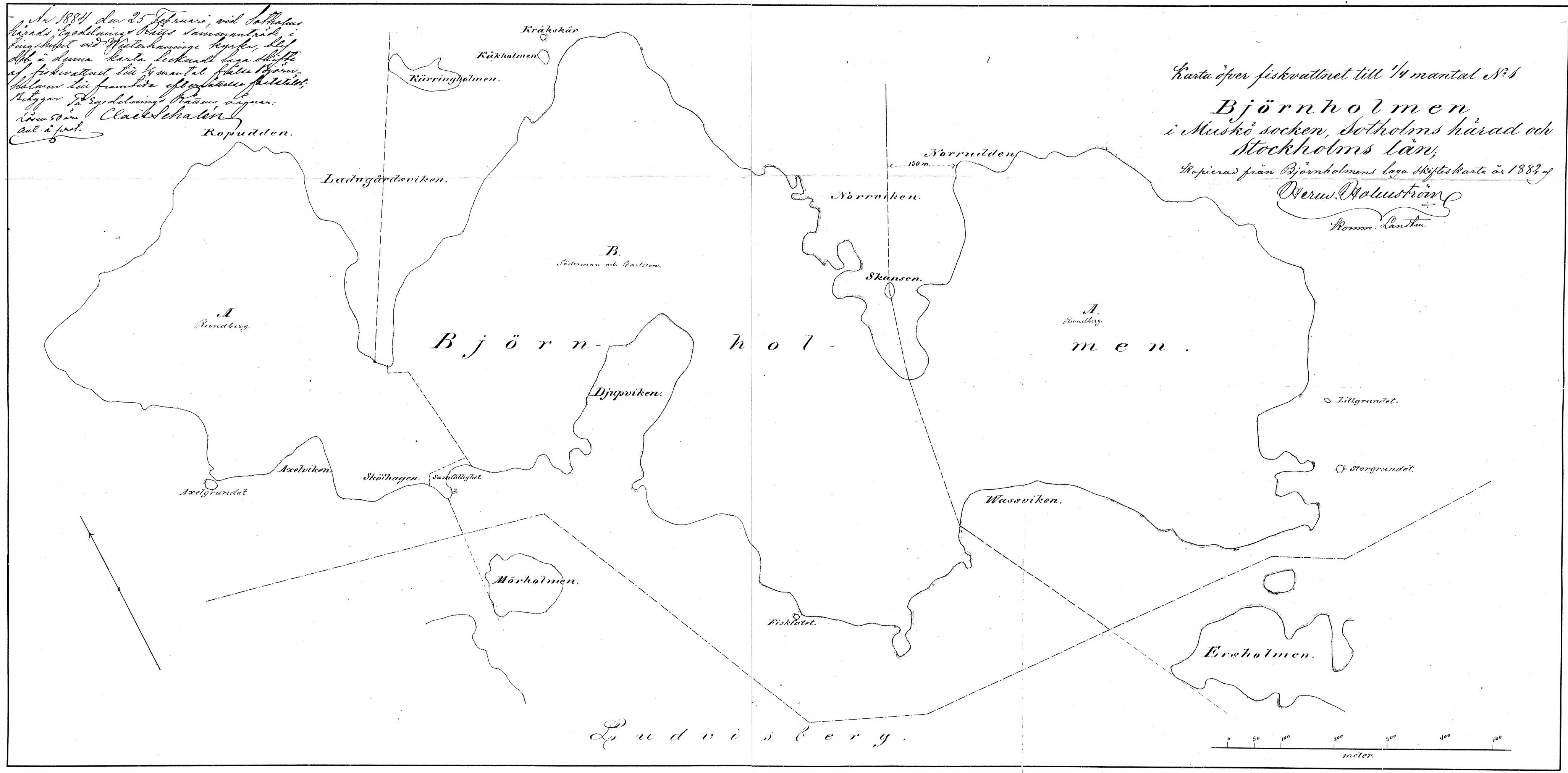 Förrättningsmännen ansågo, att detta kunde vara grunden för delningen, och därefter satte man sig i båt och rodde runt ön.
