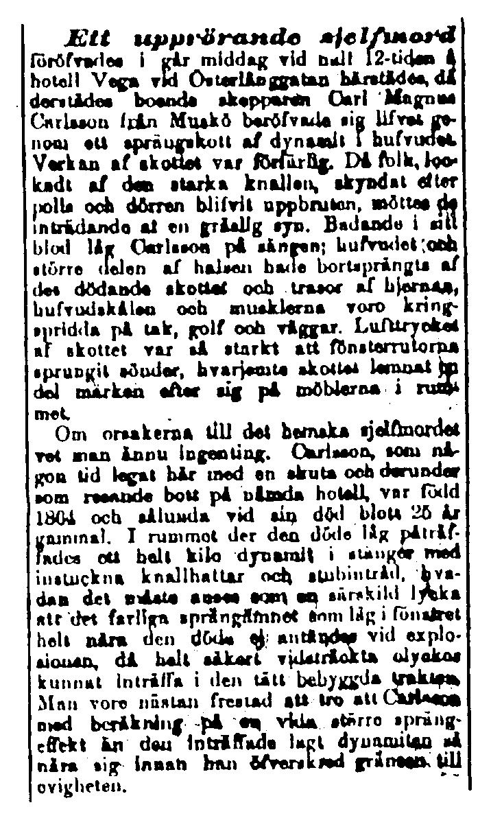“Ett upprörande sjelfmord föröfvades i går middag vid half 12-tiden å hotell Vega vid Österlånggatan härstädes då derstädes boende skepparen Carl Magnus Carlsson från Muskö beröfvade sig lifvet genom ett sprängskott af dynamit i hufvudet. Verkan af skottet var förfärlig. Då folk, lockadt af den starka knallen, skyndat efter polis och dörren blifvit uppbruten, möttes de inträdande af en gräslig syn. Badande i sitt blod låg Carlsson på sängen; hufvudet och större delen af halsen hade bortsprängts af det dödande skottet och trasor af hjernan, hufvudskålen och musklerna voro kringspridda på tak, golf och väggar. Lufttrycket af skottet var så starkt att fönsterrutorna sprungit sönder, hvarjemte skottet lemnat en del märken efter sig på möblerna i rummet.