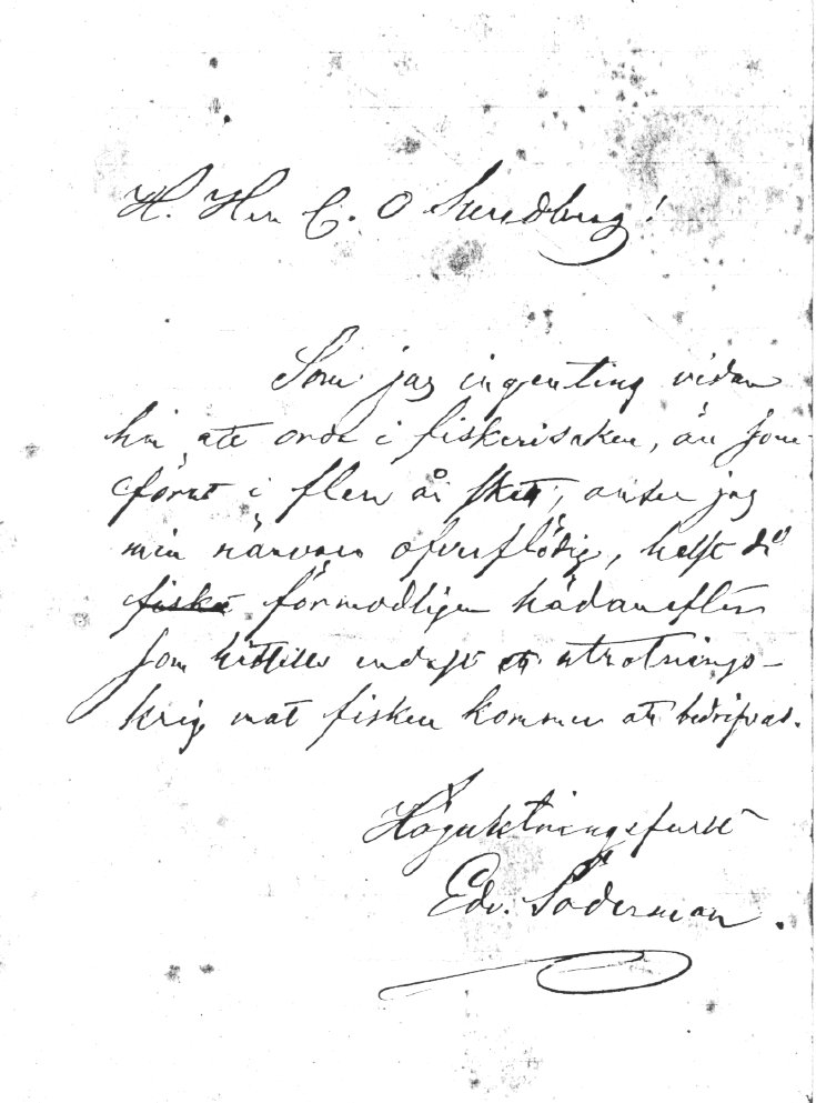 “Som jag ingenting vidare har att orda i fiskerisaken, än som förut i flera år skett, antar jag min närvaro överflödig, helst då förmodligen hädanefter som hittills endast ett utrotningskrig mot fisken kommer att bedrifvas.”