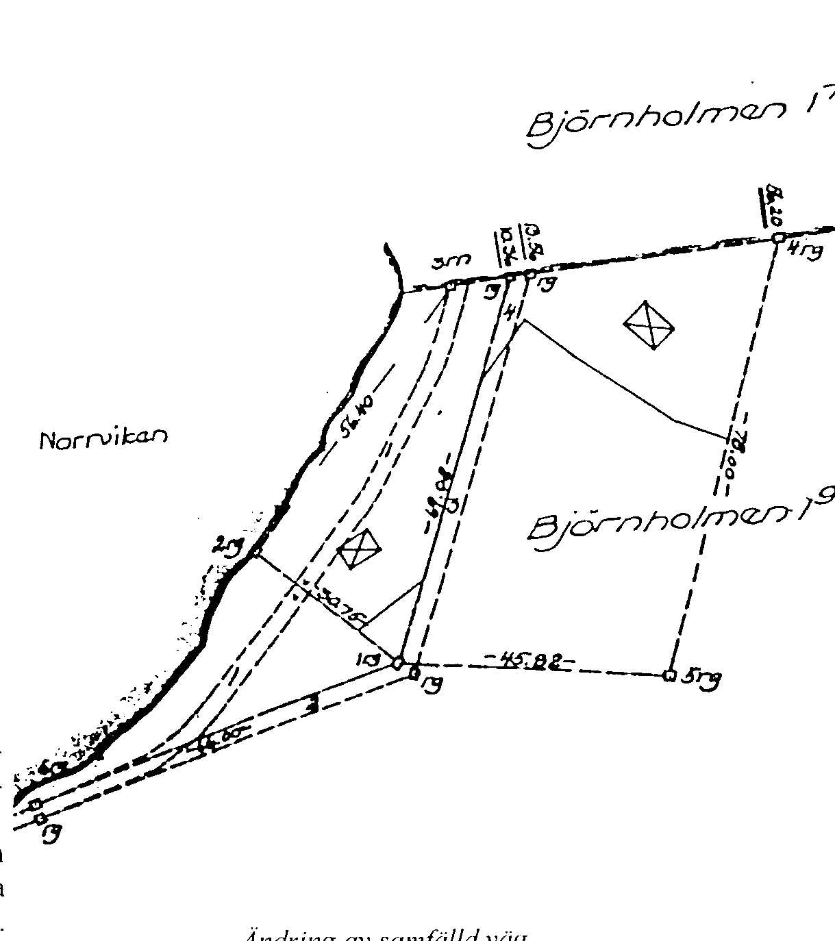 En ny lantmäteriförrättning måste nu begäras med avsikt att genom ägoutbyte få vägens sträckning fastställd. Lantmätare Eriksson påbörjade förrättningen den 21 oktober 1946 och kallade var ägarna till Björnholmen 1:7 Erik Sellman och Sven Herzog, till Björnholmen 1:8 Anna Hellström och till Björnholmen l :9 Ernst Rundberg jämte två gode män, Ragnar Karlsson och Sigge Eriksson.