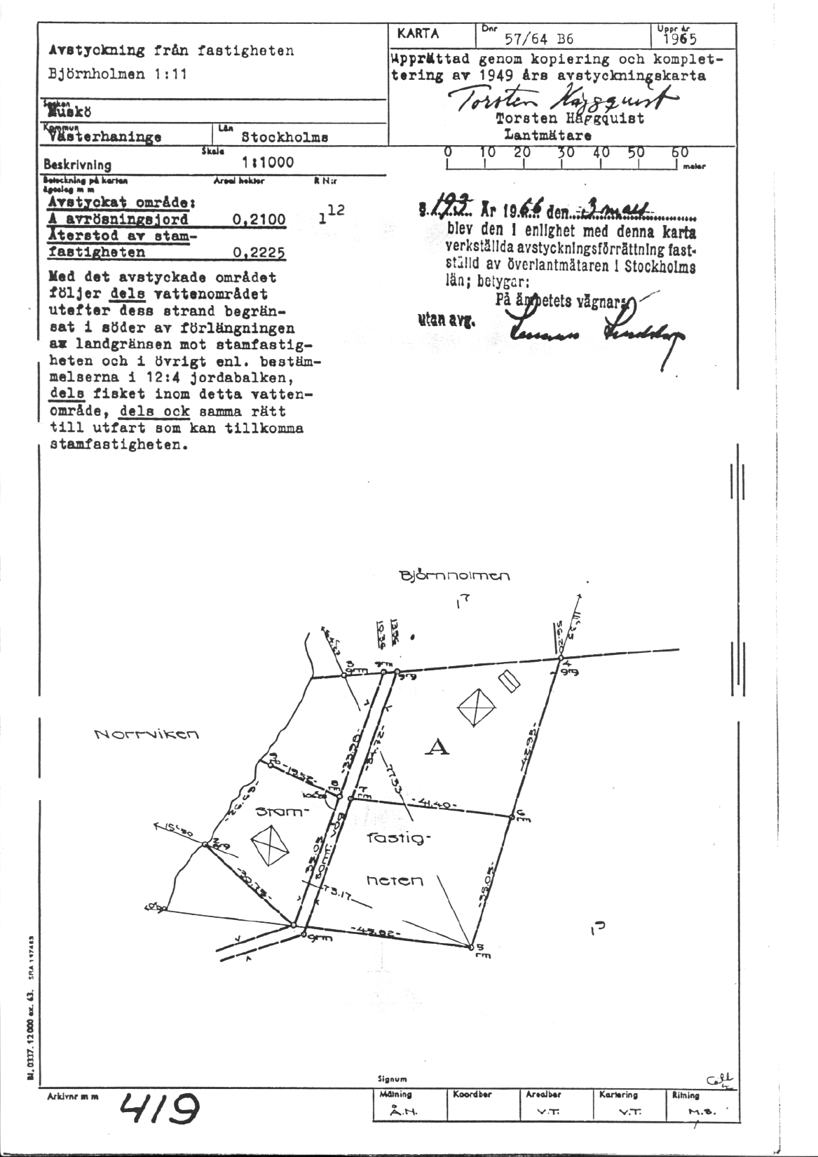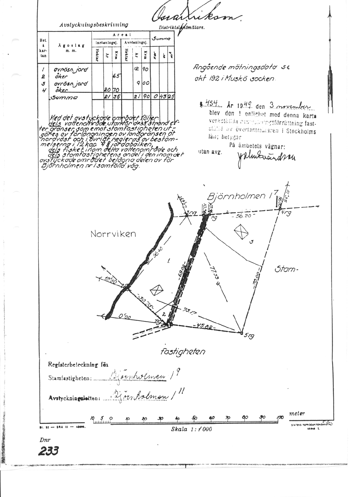 En ny tomtkarta upprättades med den samfällda vägen inritad (se karta). Genom denna väg minskade den ursprungliga arealen från 0,4520 till 0,4325 hektar. Avstyckning fastställdes av överlantmätaren den 3 november 1949 och fick då registerbeteckningen Björnholmen 1:11.